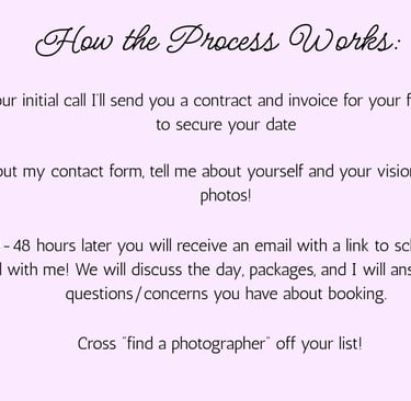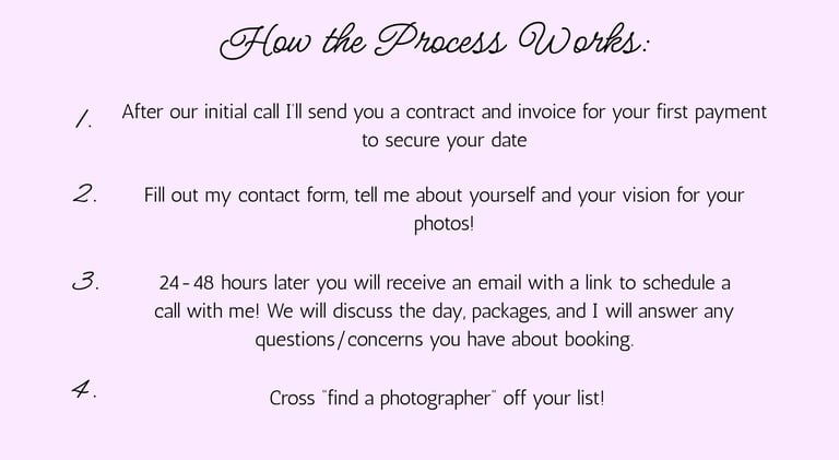 To best serve you and guide you in the right direction, I love to start by chatting about your vision for your photos over zoom (30 minutes). If you're interested, please provide the best date & time over the next week that works for you! Please also let me know if you prefer facetime or a regular phonecall for our call :) This way we don't waste either of our time if we aren't the right fit.